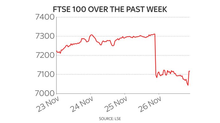 London’s leading share index opened 1.2% or 82 points higher at 7,126 following its 3.6% decline on Friday that saw travel and energy stocks hammered as investors fretted over the likely impact on demand.